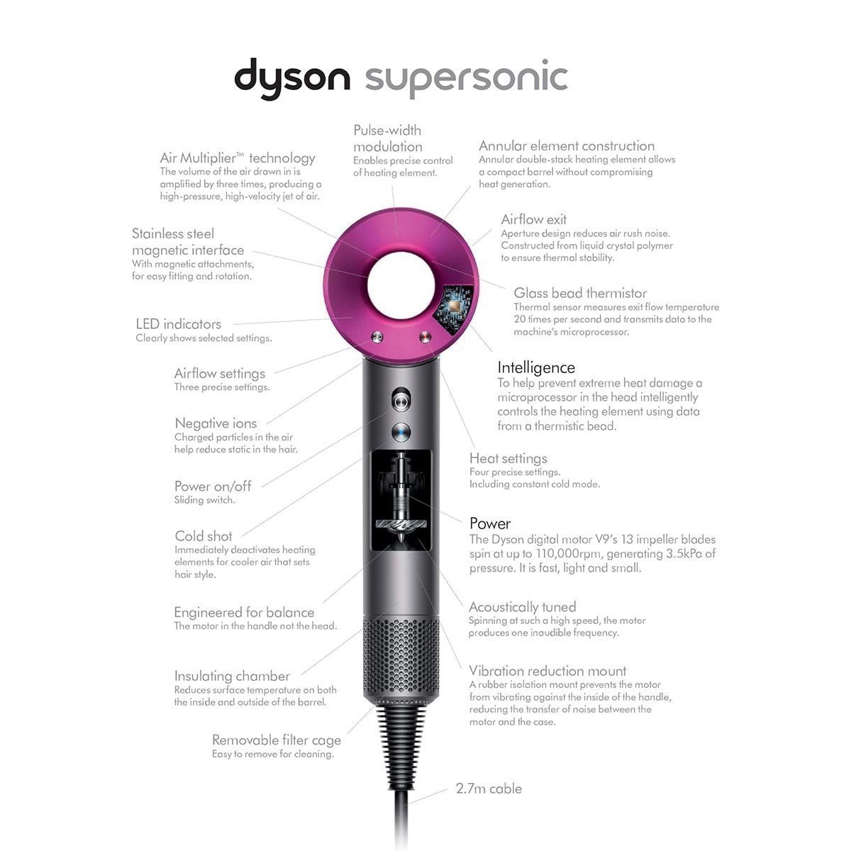 - Patented air multiplier technology for faster drying ; Airflow (lps): 41 ; Cord length: 2.8m ; Performance Features: Air Multiplier technology amplifies airflow to produce a controlled, high-velocity jet of air for fast drying