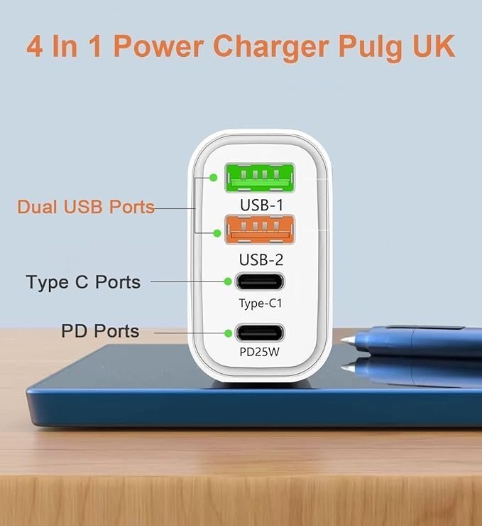 - 【PD25W+QC 3.0 Fast Charging】: 2 USB C and 2 USB A ports, both supporting fast charging, can adapt to different currents according to different devices, ensuring voltage stability and safety while fast charging devices.