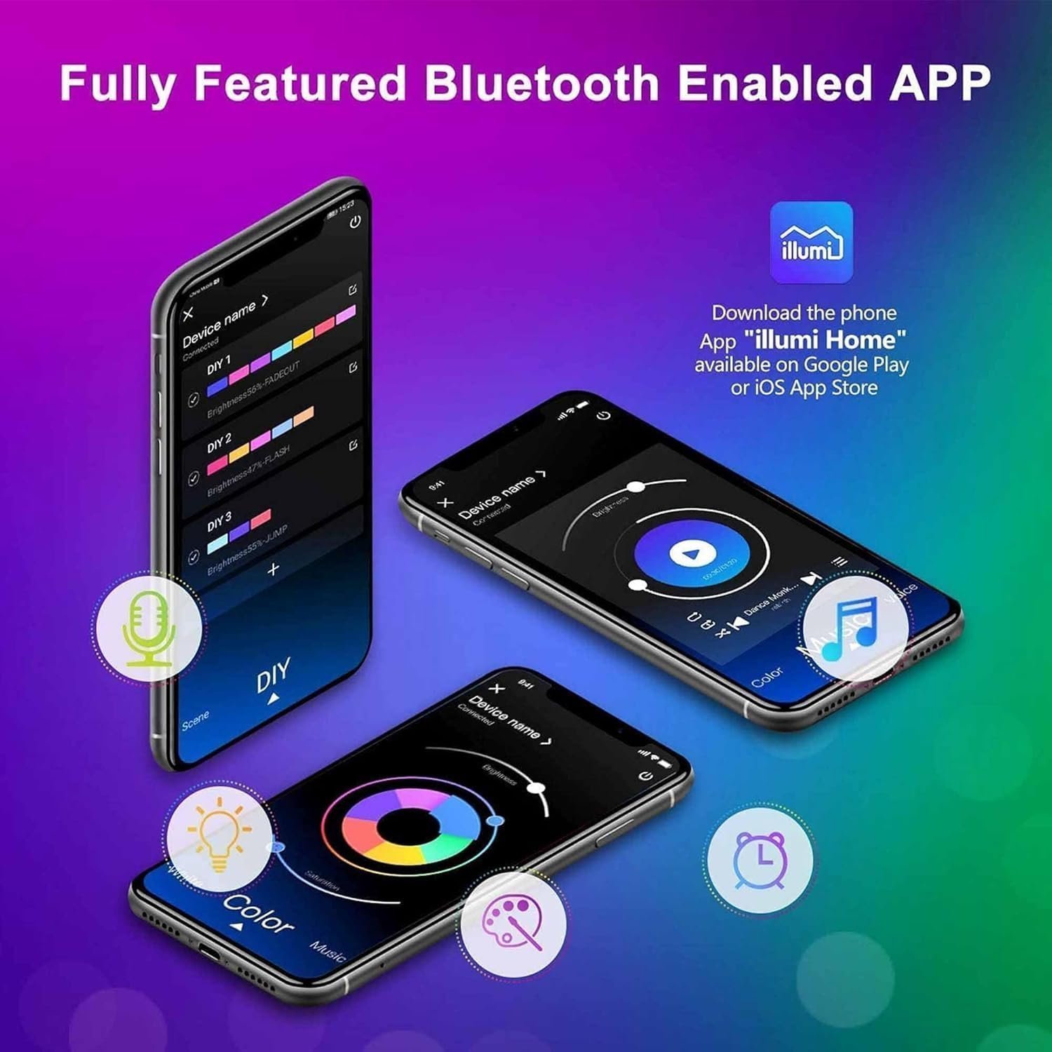 - Multi-way to control: Come with 44-key remote and phone App control(“Illumi home” available on Google Play and iOS App Store), you can adjust the brightness, change color, on/off the lights. Come with sensitive built-in mic, lights will pulsate and change colors along with the environmental sound and music when you set to music mode.(Connectors are not included.)
