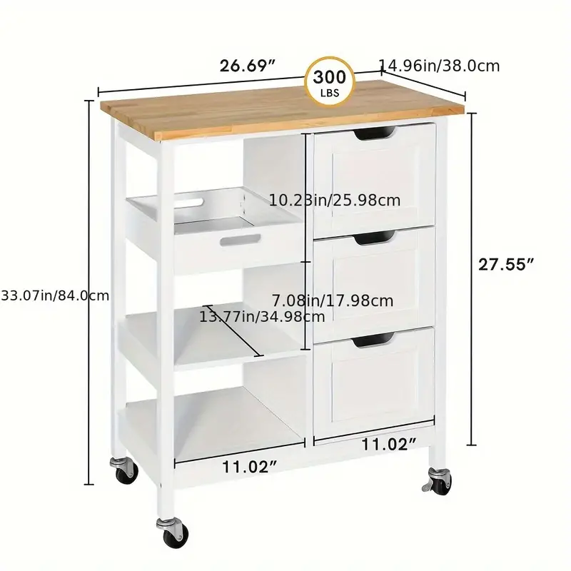 The Phabules Rolling Kitchen Island Cart offers a versatile and stylish storage solution for your kitchen. Designed with a sturdy wood and wood-based panel construction, it features a durable countertop, a spacious drawer, and three tiers of storage shelves. The rolling design with smooth wheels allows for easy mobility, making it perfect for organizing and transporting kitchen essentials. Its elegant white finish complements various kitchen styles, while the hardwood craftsmanship ensures durability. With no need for electricity, this cart is an eco-friendly addition to any home, providing both functionality and charm.